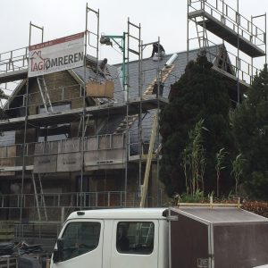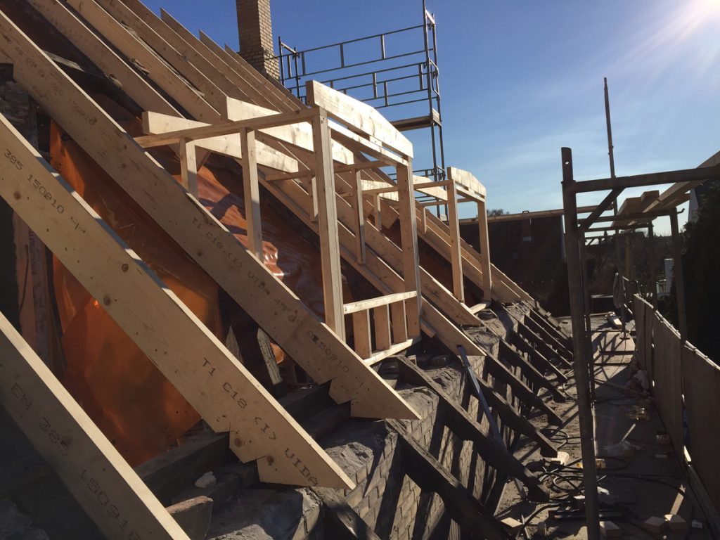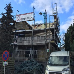 Kunden havde netop købt nyt hus og skulle etablere en 1. sal. For at få bedst mulig udnyttelse, faldt valget på en mansard-løsning. Ny tagkonstruktion blev opført, 4 flotte buede kviste blev lavet samt et solidt naturskifer tag blev lagt.
