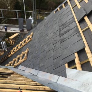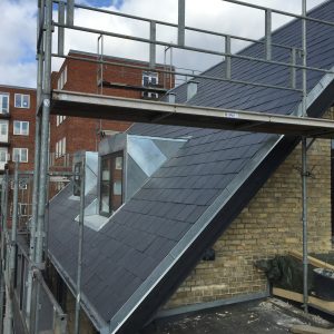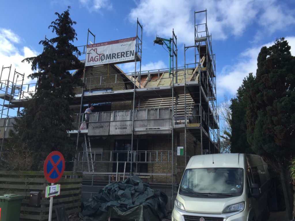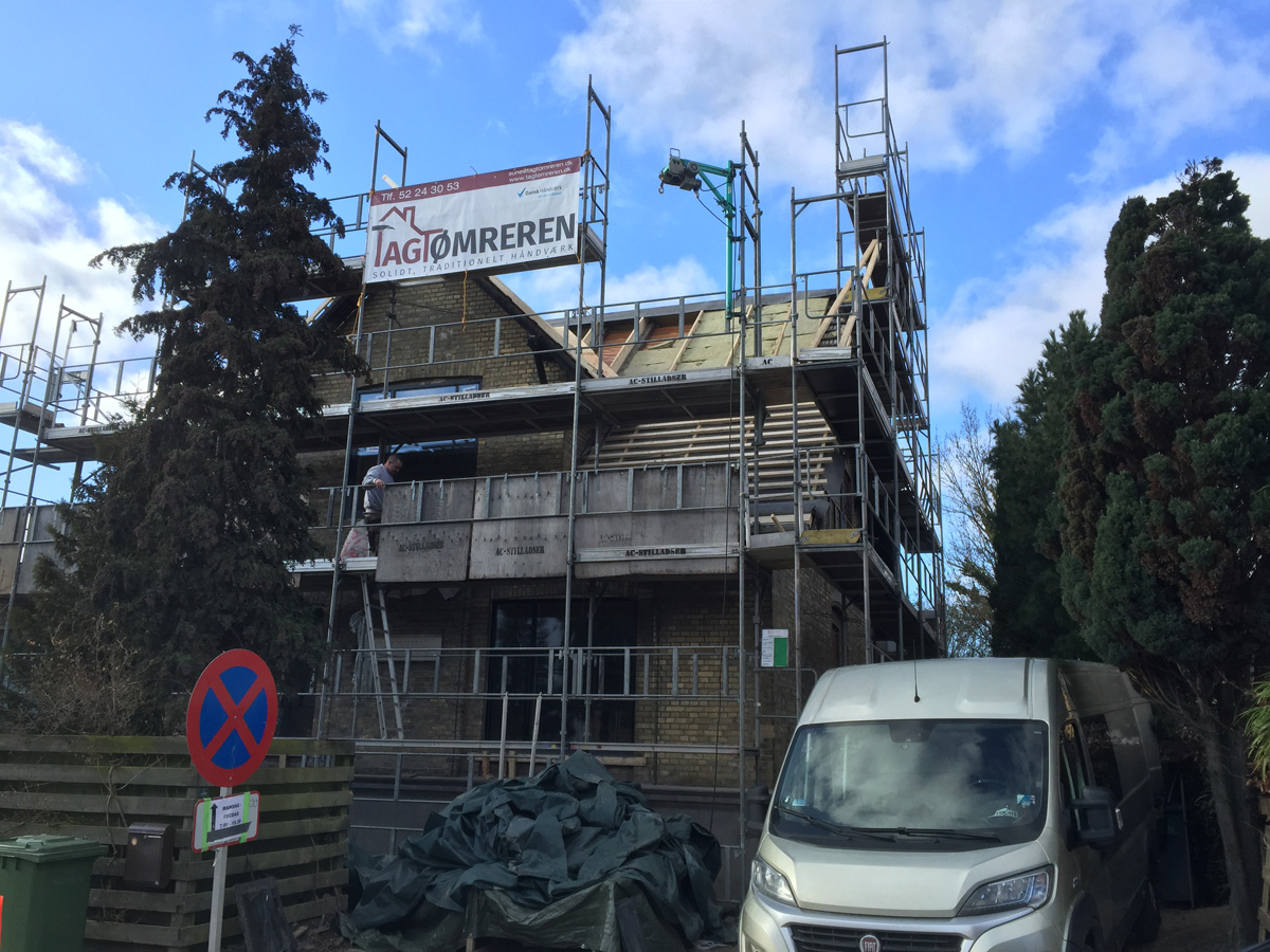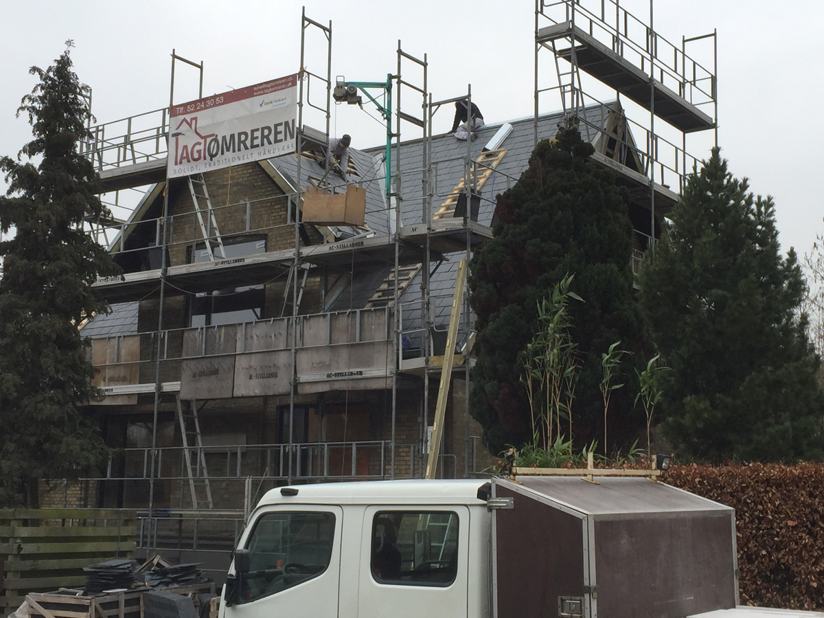 Det eksisterende tag var naturskifer og kunden ville gerne beholde det flotte naturlige udseende. Derfor fandt vi en mindre bekostelig tagsten, som samtidig er 80 % genbrugsskifer. De fik også en ny altankvist til deres tagterrasse.