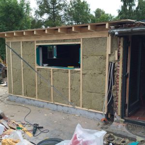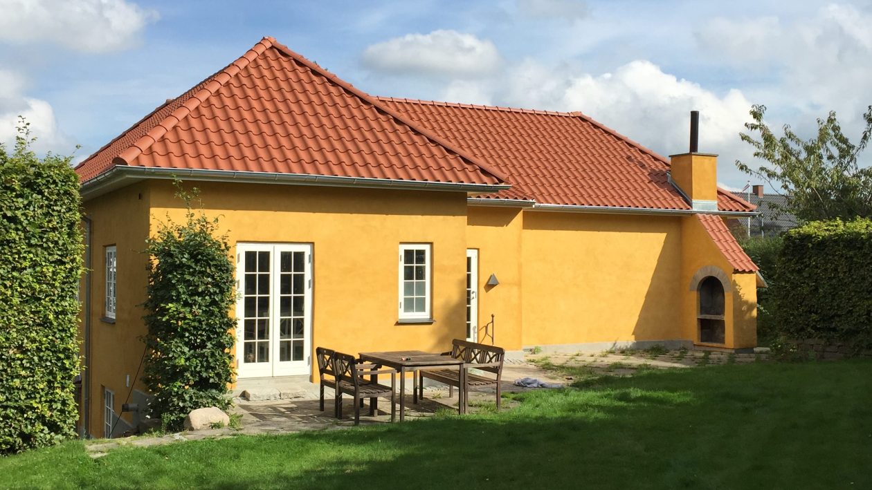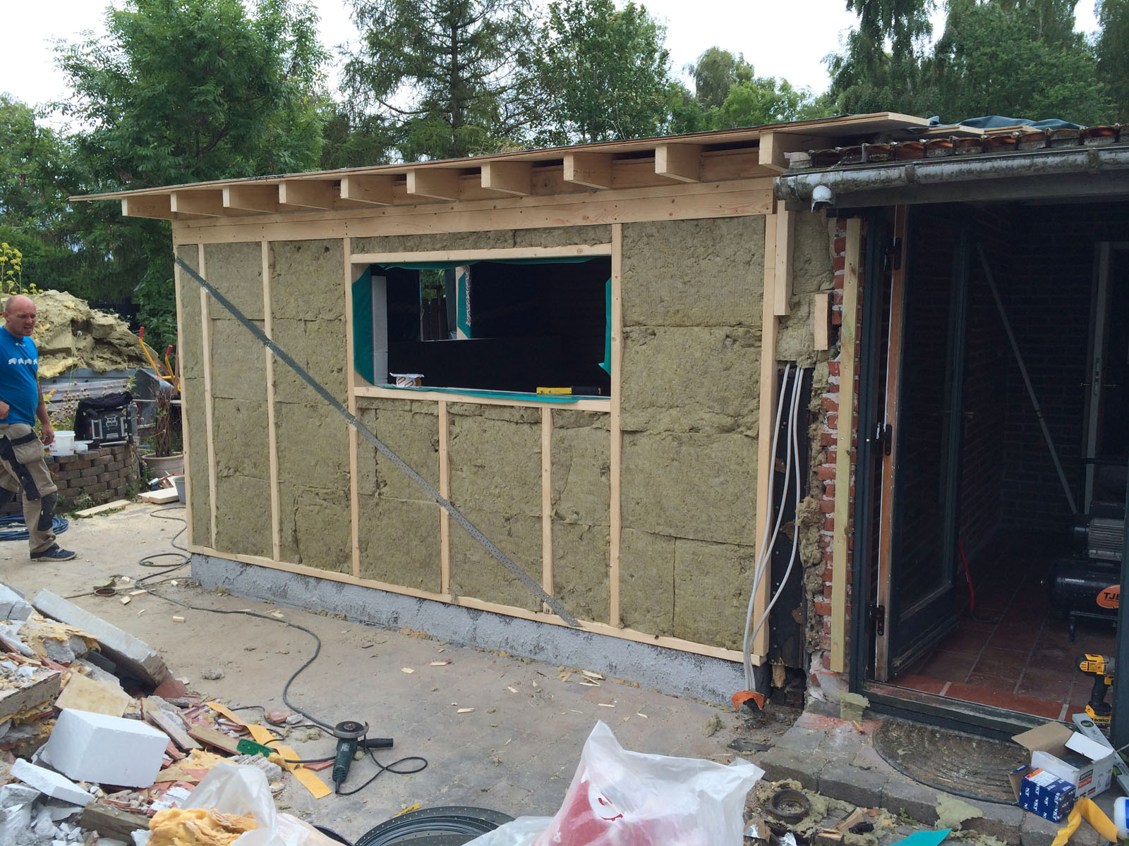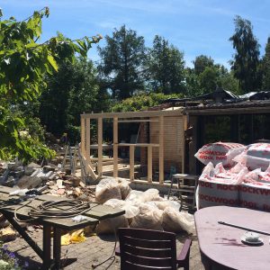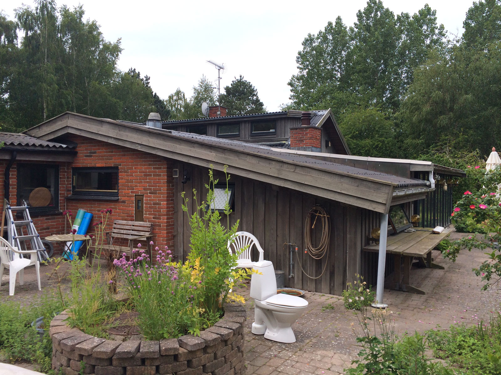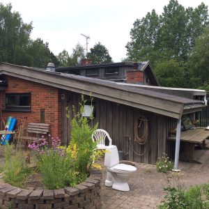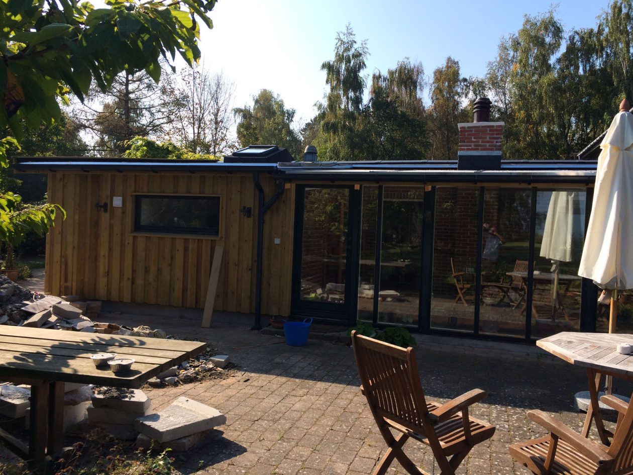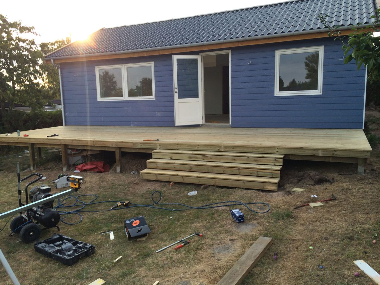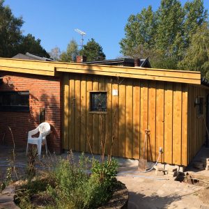 Nyt kolonihavehus i Herlev. Huset blev opført på punktfundament, i modsætning til et fuldt fundament. Hele huset er lavet i træ, med vedligeholdelsesfri beklædning